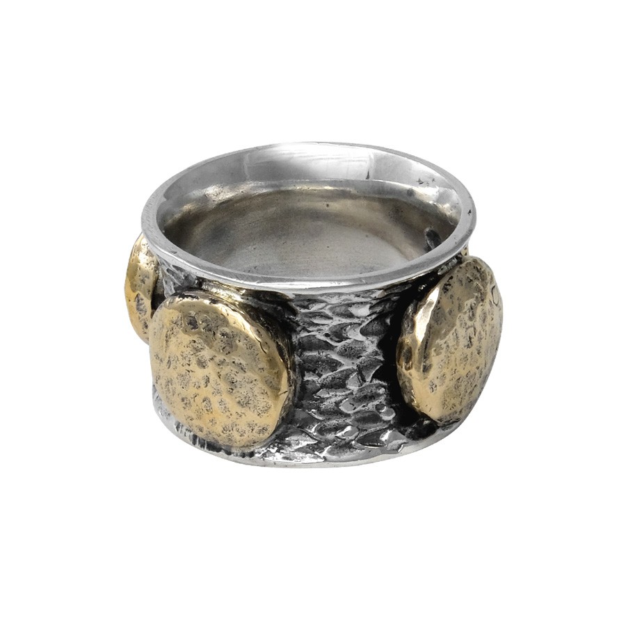 Anello fascia in argento 925 di altezza mm 15 circa con quattro elementi tondi in bronzo saldati sulla parete. Si consiglia di ordinare una misura più comoda.