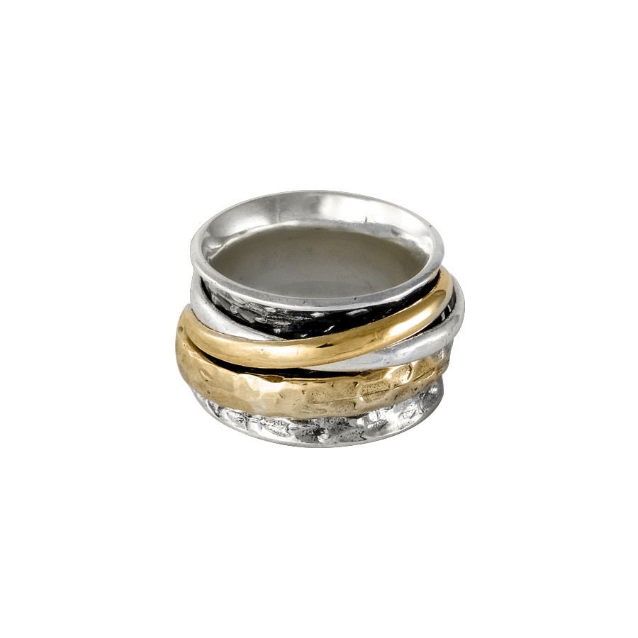 L’anello consiste in una fascia concava in argento 925 di altezza mm15 circa nella quale sono collocati tre anelli in argento e bronzo in movimento. Si consiglia di ordinare una misura più comoda.