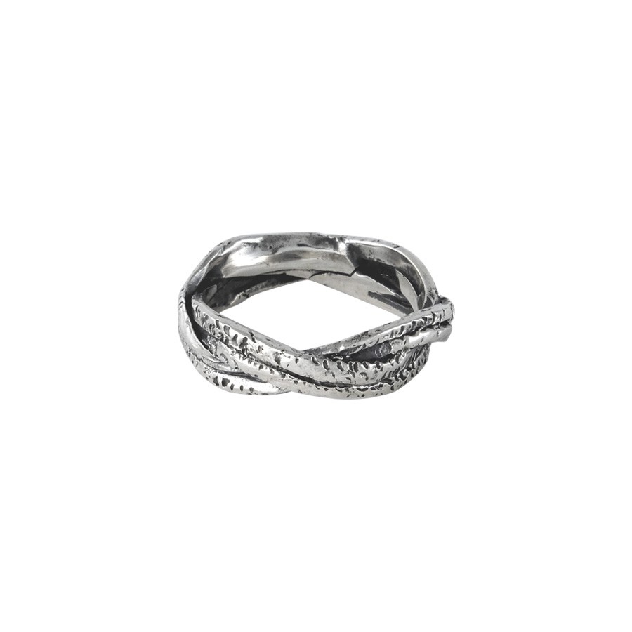 Anello rigido in argento 925 composto da due fili martellati e intrecciati a mano. Altezza circa 5 mm. Indossabile insieme alla versione in bronzo