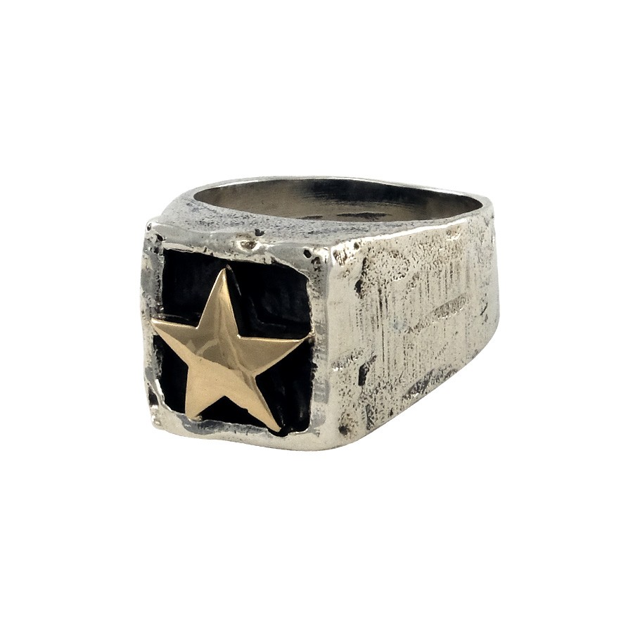 Anello da mignolo in argento 925 di forma quadrata martellato a mano con stella in bronzo realizzata e saldata a mano