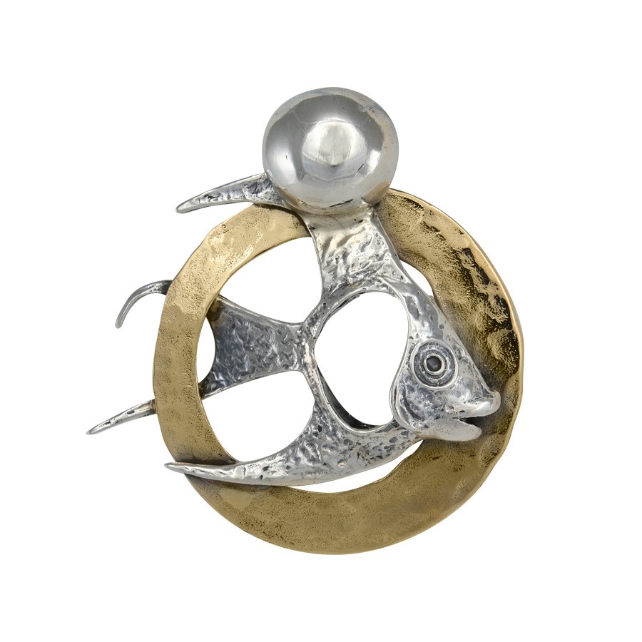 Il ciondolo è composto da un cerchio in bronzo nel quale è incastrato un pesciolino realizzato a mano in argento 925. Completa il ciondolo la contromaglia in argento sferica. La lunghezza totale è di circa 58mm e la larghezza di circa 50mm