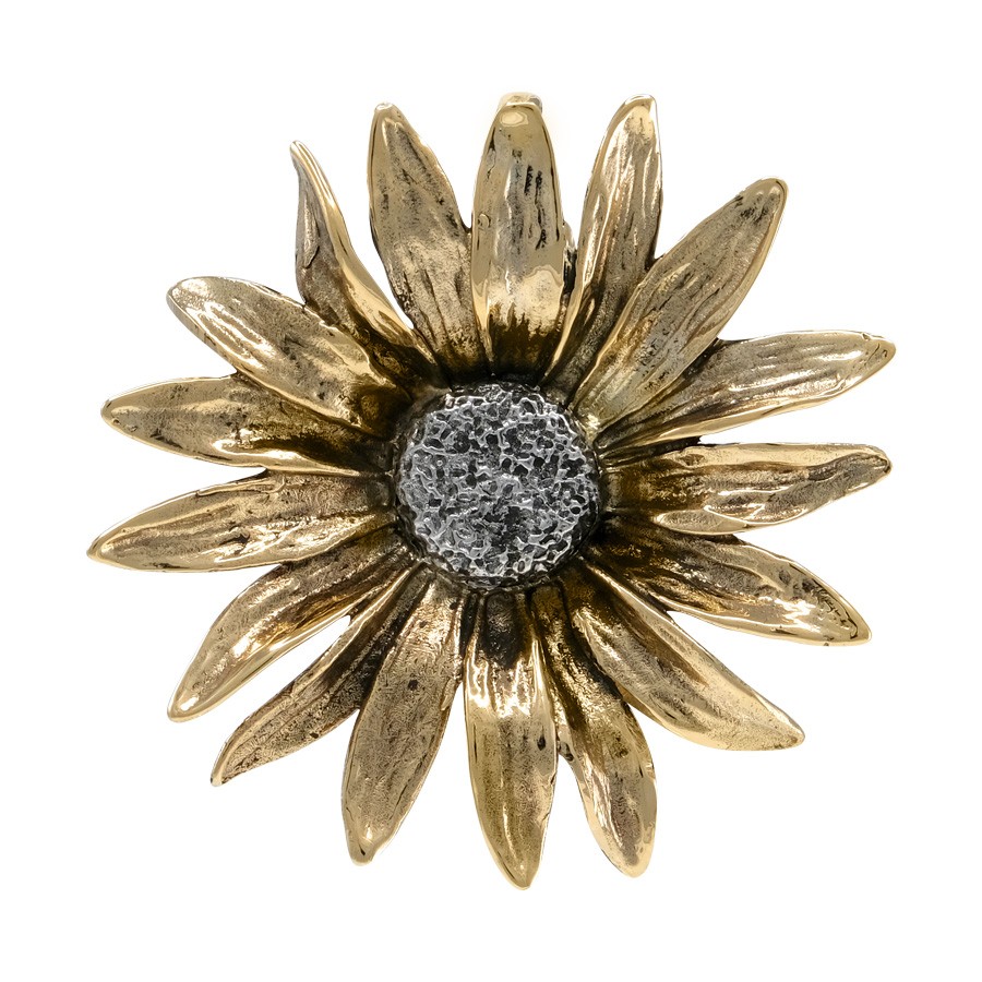 Ciondolo a forma di gerbera realizzata a mano in bronzo con centro in argento 925. Il diametro è di circa 60 mm
