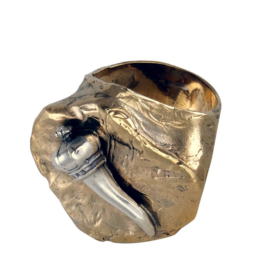 Anello realizzato a mano in bronzo con fascia di circa 10mm con parte superiore irregolare di circa 30 mm di larghezza (massima) e 23 mm di altezza (misura massima) con corno in argento di circa 20mm finemente lavorato e saldato a mano. La fascia vuota dell’anello ne esalta la comodità nonostante la dimensione preservandone la robustezza
