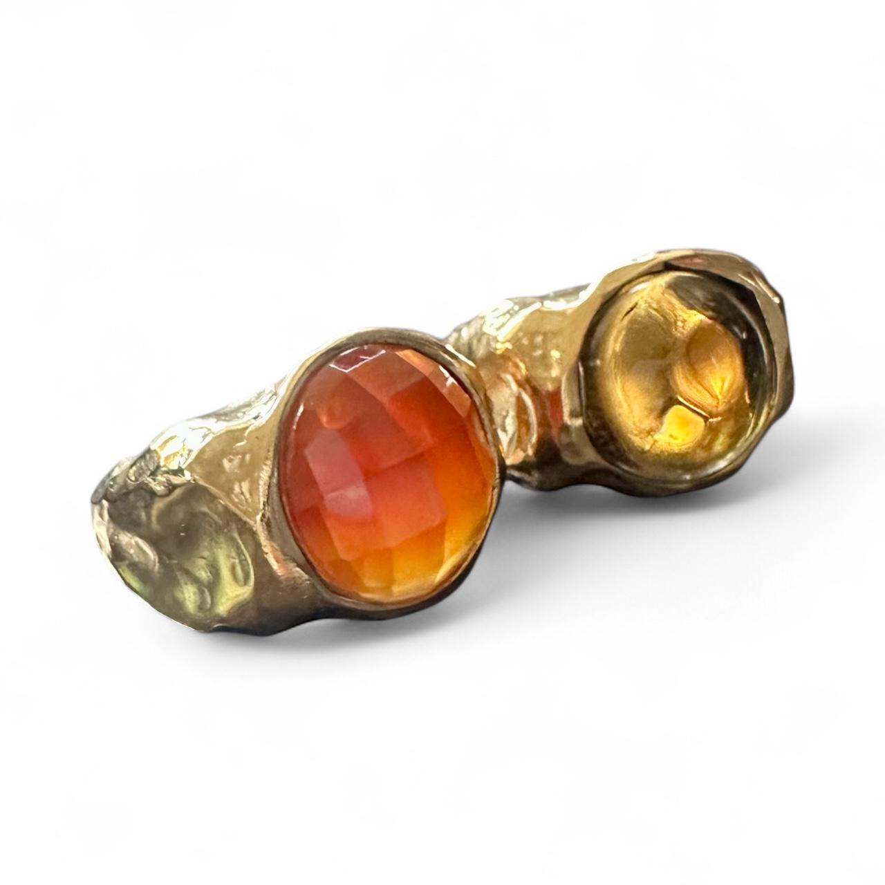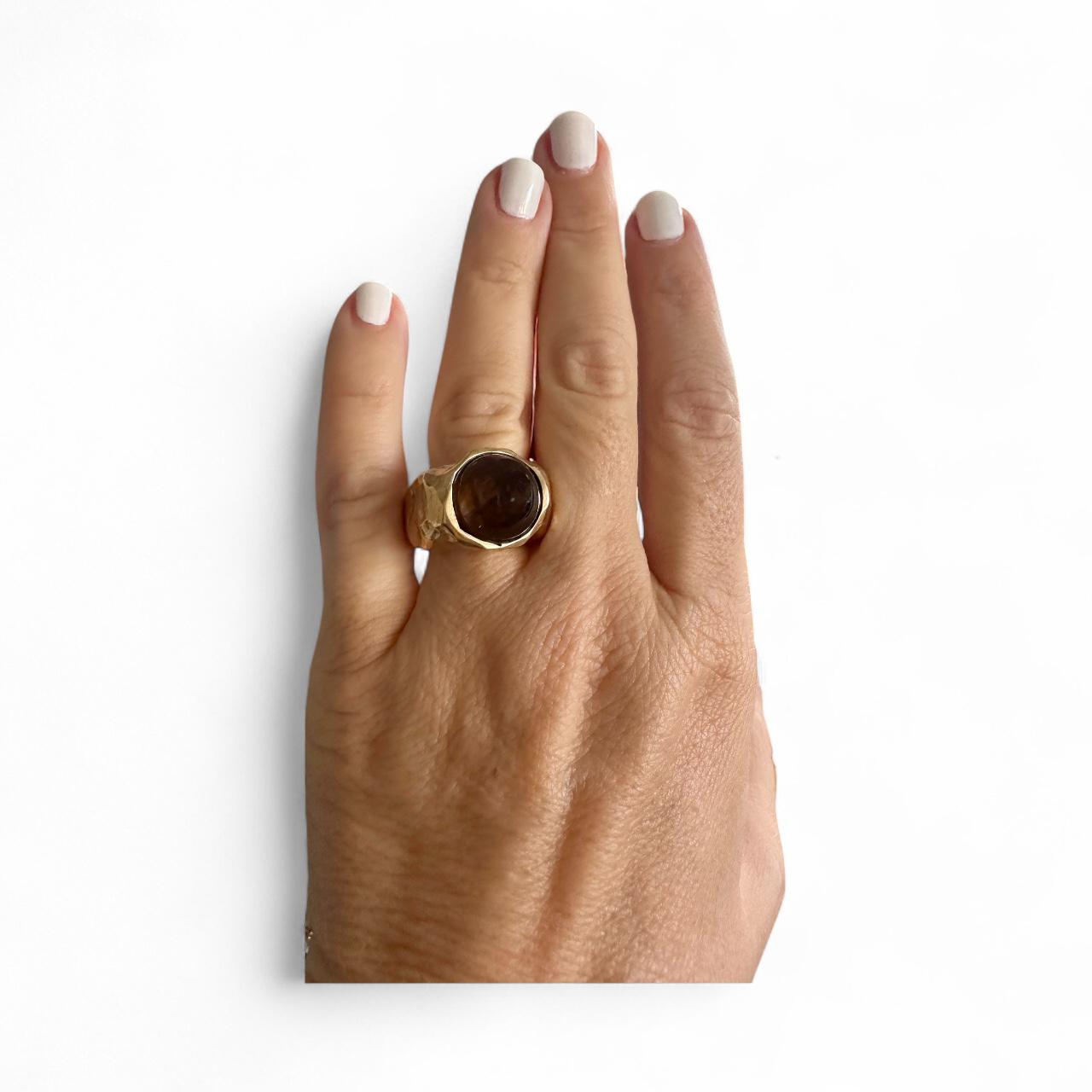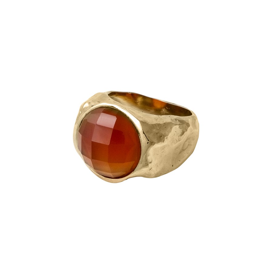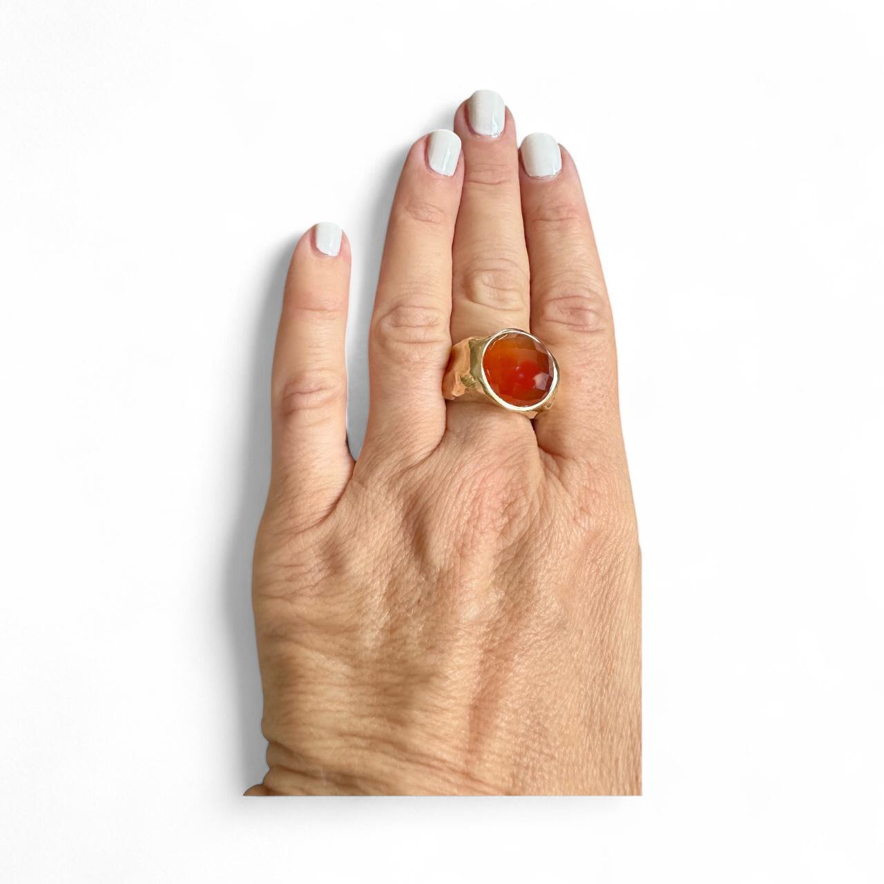 Anello realizzato a mano in bronzo sagomato per accogliere una madreperla di diametro 16mm. Disponibile con corniola faccettata, onice nera, quarzo fumè. Disponibile la versione placcata in oro 18kt.