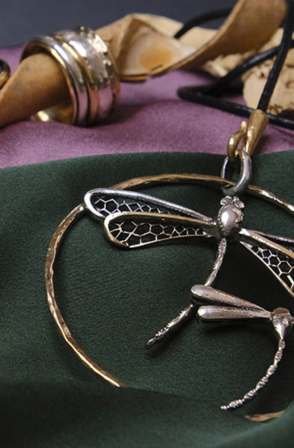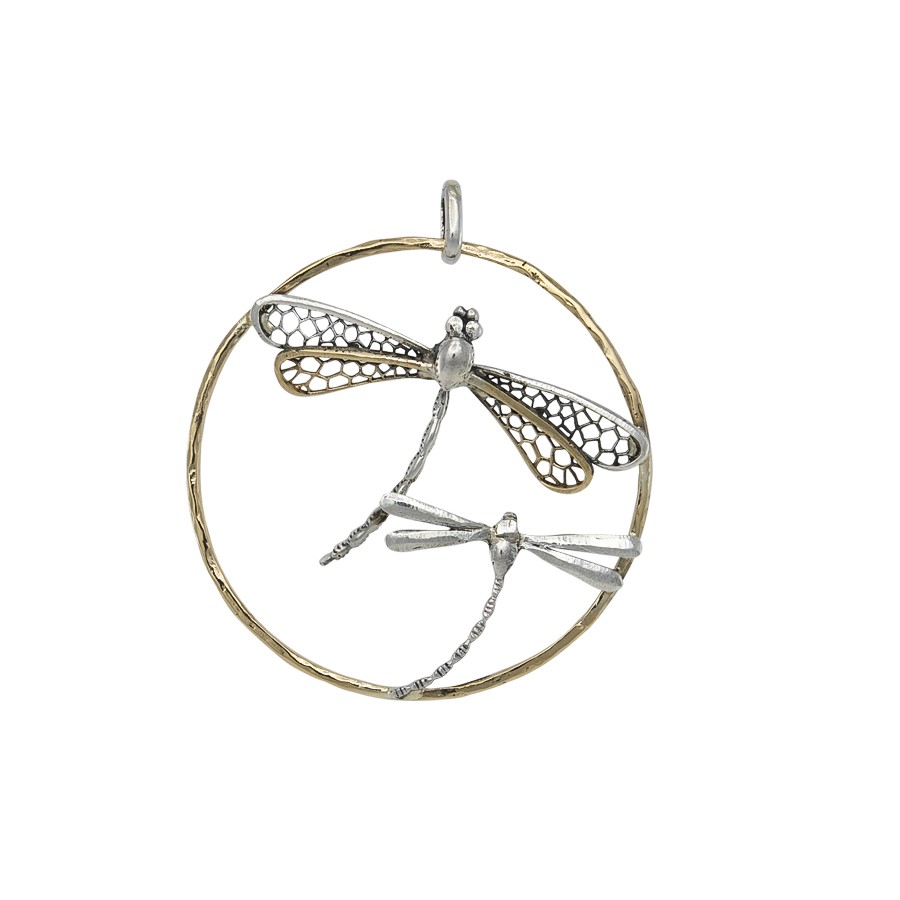 Il ciondolo è composto da un cerchio in bronzo avente spessore 2mm e diametro di mm 70 sul quale sono appoggiate due libellule realizzate a mano in argento 925 di diverse dimensioni.