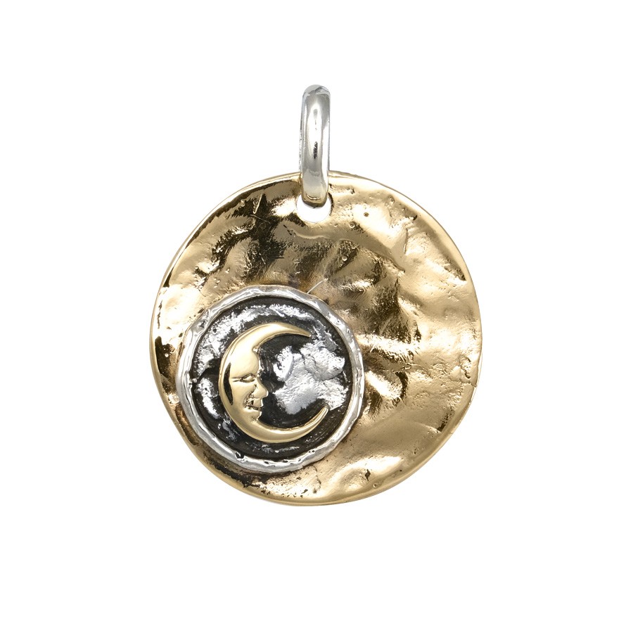 Il simbolismo rappresenta la luna come corpo illuminato: priva di luce propria riflette il sole, attraversa delle fasi e cambia forma. Proprio per questo essa rappresenta la dipendenza ed il principio così come periodicità e rinnovamento. Il ciondolo è realizzato da una piastra tonda in bronzo di diametro 35mm che riporta una piastrina più piccola in argento 925 con una luna realizzato a mano